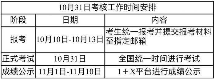 本次考核时间定于2025年10月31日上午,全国统一时间进行考核,考核为上机考试,理论与实训联考(高级180分钟)。具体时间安排如下:
