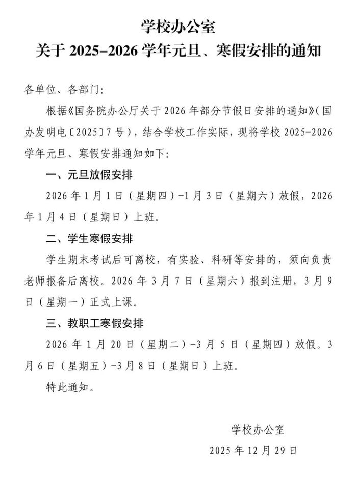 学校办公室关于2025-2026学年元旦、寒假安排的通知